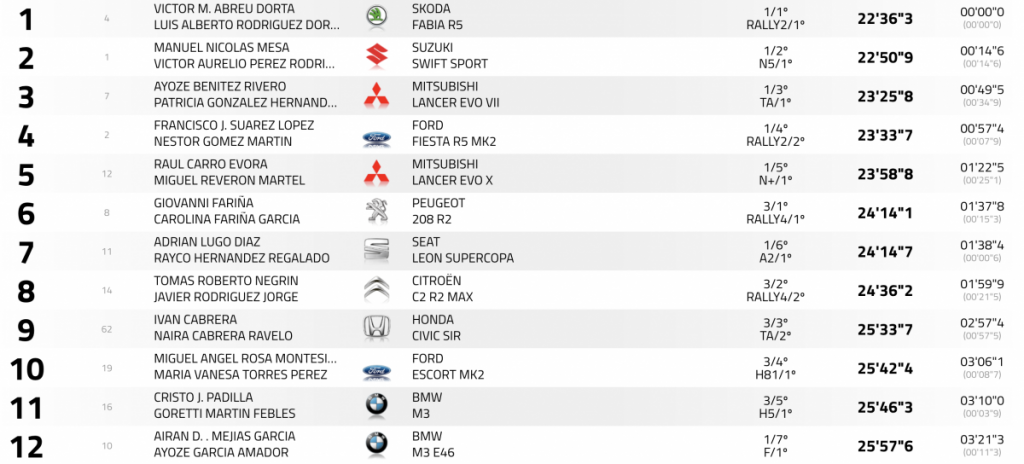 Raúl Carro y Miguel Reverón sitúan su Mitsubishi Lancer Evo X en la quinta plaza de la general en su debut con la nueva montura, seguidos de a 15.3 de Giovanni Fariña y Carolina Fariña (Peugeot 208 R2), que superan en sólo 0.6 a Adrián Lugo y Rayco Hernández (Seat León Supercopa), séptimos.
