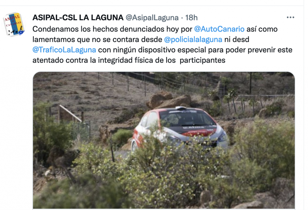 La Asociación Sindical Independiente de Policías Locales de Canarias (ASIPAL-CSL La Laguna), ha mostrado su sorpresa y malestar por lo ocurrido en la jornada de este pasado durnate la disputa del Rally Ciudad de La Laguna, donde un desalmado, porque no se le puede denominar de otra manera, soltó clavos en el tercer tramo de la cita tinerfeña.