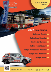 En 2022 siete serán los rallyes que dicten sentencia para proclamar un nuevo campeón de la Copa Suzuki Swift. Siendo todos ellos de asfalto como se acostumbra, la principal novedad reside en que los equipos podrán disputar tres eventos internacionales: una prueba del ERT: Rallye Princesa de Asturias; una prueba del ERC: el Rallye Islas Canarias; y una prueba del WRC: el Rallye RACC.