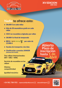 El Suzuki Swift Sport será de nuevo el protagonista en el certamen en el que los pilotos podrán inscribirse durante los tres primeros meses del 2022, y pondrán a prueba sus habilidades desde el mes de Abril hasta finales de octubre.