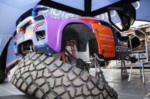 Todo el chasis está diseñado para soportar la dureza del Dakar y sortear con eficacia los obstáculos de su recorrido. Para ello cuenta con unos impresionantes neumáticos BF Goodrich de 37 pulgadas de diámetro (con sistema de inflado/desinflado con control electrónico) y con unas suspensiones de doble horquilla con un impresionante recorrido de 440 mm.