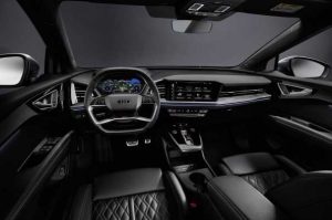 El puesto de conducción de los Q4 e-tron y Q4 Sportback e-tron ofrece un diseño tridimensional y los distintos conjuntos de control y pantallas se integran como elementos de diseño. La instrumentación digital se enmarca en un cuadro con forma de rombo entre dos volúmenes; uno corto en el lado izquierdo, y otro más largo en el lado derecho. La pantalla central del MMI touch está orientada hacia el conductor. Inmediatamente por debajo se ubica la unidad de mando para la climatización. Más abajo, un gran panel de mandos con acabado black panel integra el compacto selector de marchas y diversos botones. Los volantes incorporan superficies táctiles con acabado black panel, cuyas zonas funcionales también tienen retroiluminación para indicar los respectivos mandos activos. Ligeras protuberancias sirven de demarcación entre funciones para facilitar el manejo, y los botones tienen respuesta háptica al presionarlos. Además, estos modelos pueden incorporar un head-up display con realidad aumentada, que refleja información relevante en el parabrisas en dos niveles separados.
