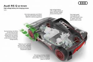 La batería del Audi RS Q e-tron se va recargando durante la conducción con la energía procedente del convertidor de energía y de una tercera unidad MGU, que actúa en este caso como un generador. Se han diseñado y programado algoritmos para mantener el nivel de carga de la batería dentro de unos rangos definidos en función de la demanda de energía. La potencia de los motores-generadores instalados en los ejes delantero y trasero está limitada a un máximo de 288 kW, para cumplir con la normativa. Sin embargo, el convertidor de energía sólo puede proporcionar una potencia de carga máxima de 220 kW. Por tanto, únicamente en casos extremos, el consumo es ligeramente superior a la capacidad de generación de energía.