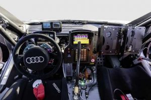 Con su concepto de control y manejo, el Audi RS Q e-tron redistribuye varias funciones entre el conductor y el copiloto. Hay ocho botones en el volante, situados directamente delante del conductor. Detrás del volante se ubica una pantalla que proporciona información sobre la presión de los neumáticos, el sentido de la marcha seleccionado, la velocidad actual y diferentes alertas. Dos pequeños displays instalados por encima y hacia el parabrisas funcionan a modo de “repetidores” y aportan información esencial en el campo de visión: a la izquierda se muestra la dirección que indica la brújula, mientras que a la derecha aparece la velocidad. Una pantalla situada justo en el centro del salpicadero ofrece información sobre la presión de los neumáticos, el reparto de frenada, el sistema brake-by-wire y muchas otras funciones. La información se resalta en color verde mientras los distintos sistemas funcionan de forma correcta, o en rojo cuando se produce un error. Debajo de esta pantalla se localiza un panel de interruptores cuyas teclas individuales reaccionan de forma sensible al tacto con un punto de presión. Para orientarse en el terreno y, al mismo tiempo, mantener la ruta prescrita, los copilotos tienen que consultar las pantallas de dos tablets.