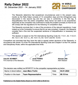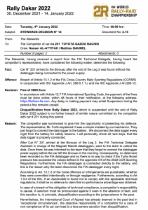 Según el reglamento técnico de la FIA esto supone la descalificación del equipo infractor, lo que debe ser que se olvidaron a la hora de redactar la norma que era para todos menos para Nasser Al-Attiyah, puesto que a los comisarios deportivos les valieron las explicaciones aportadas como defensa por parte de los componentes del equipo Toyota, que focalizaron el incidente como un error humano al olvidarse los mecánicos de conectar la caja negra. Esto fue suficiente para no excluirle y sí sancionarles con 5.000 euros de multa… De risa.