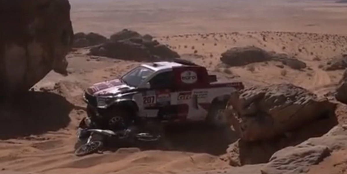 Según el de Toyota «estaba yendo lento y vi a un motorista a la izquierda y una piedra en la arena me hizo golpearle. Di marcha atrás con el coche. Cuando se levantó y me dio paso con sus brazos entendí que se encontraba bien», alegó, aunque no valió para su defensa, por lo que los Comisarios le sancionaron.