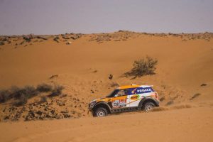 El recorrido del día, que incluía muchas pistas rápidas de arena con baches, algunas zonas de piedra y escasos pasos por dunas, era poco propicio para las características del MINI ALL4 Racing del Primax X-raid Team. Laia Sanz y su copiloto Maurizio Gerini han sabido nadar y guardar la ropa para terminar bien clasificados a la espera de la jornada de mañana, que se prevé más favorable para ellos.