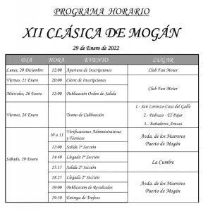 La XII Clásica de Mogán se disputará respetando todas las indicaciones sanitarias impuestas por la pandemia del COVID-19. Como es habitual, se celebrará en una sola jornada el sábado 29 de enero, con un recorrido totalmente lineal, bajo la organización de Fan Motor y la colaboración principal del Ayuntamiento de Mogán y la cadena Cordial, junto a una amplia lista de empresas colaboradoras sin las cuales no sería posible.
