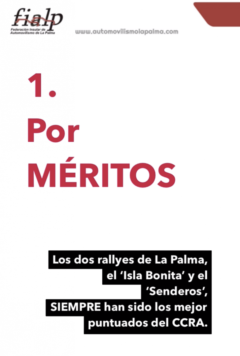 El primer punto dice que es por ‘méritos propios’, puesto que “los dos rallys, el Isla Bonita y el Senderos de La Palma, siempre han sido los mejores puntuados del CCRA”.