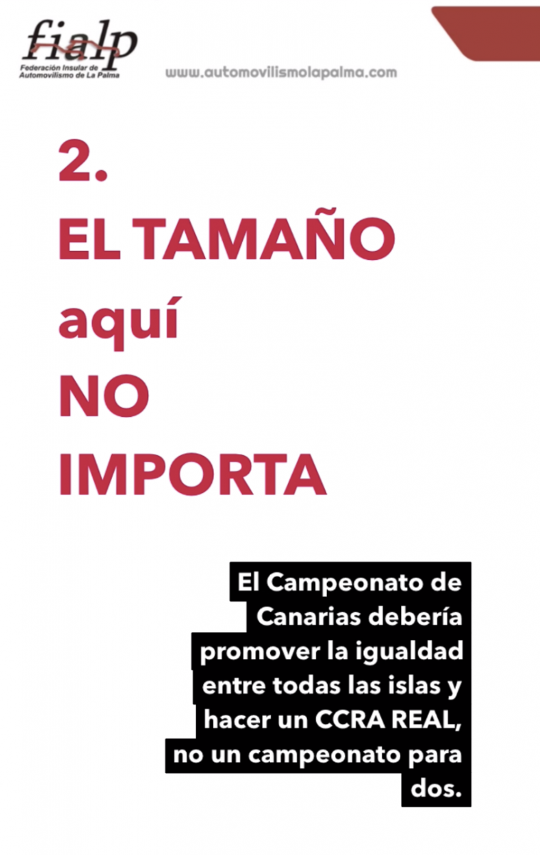 El segundo afirma que ‘el tamaño aquí no importa’, defendiendo que “el Campeonato de Canarias debería promover la igualad entre todas las islas y hacer un CCRA real, no un Campeonato para dos”.