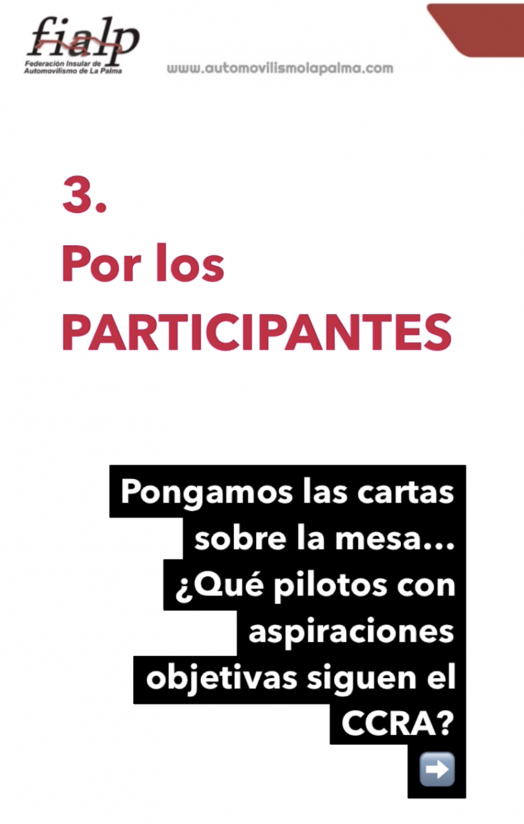 El tercero se habla de los participantes, diciendo que “pongamos las cartas encima de la mesa… ¿qué pilotos con aspiraciones objetivas siguen el CCRA? Afirman que Enrique Cruz por Tenerife, Luis Monzón por Gran Canaria, Yeray Lemes por Lanzarote y Miguel Suárez por La Palma”, volviendo a preguntarse que “¿por qué los pilotos de las islas no capitalinas deben medirse siempre en campo rival?; ¿Por qué nuestro representante sólo puede defenderse una vez en la isla y tiene que salir siempre?; ¿A caso no debe partir con las mismas oportunidades?”.