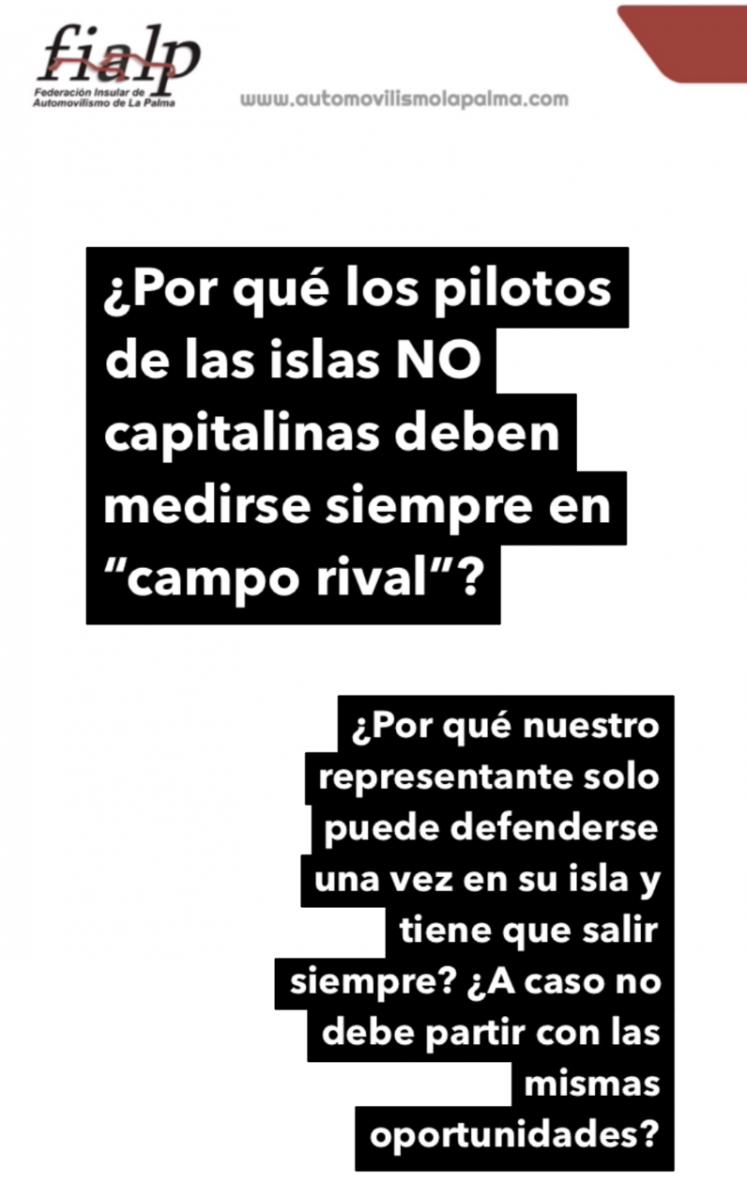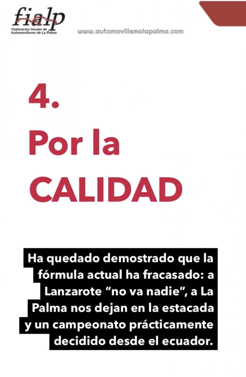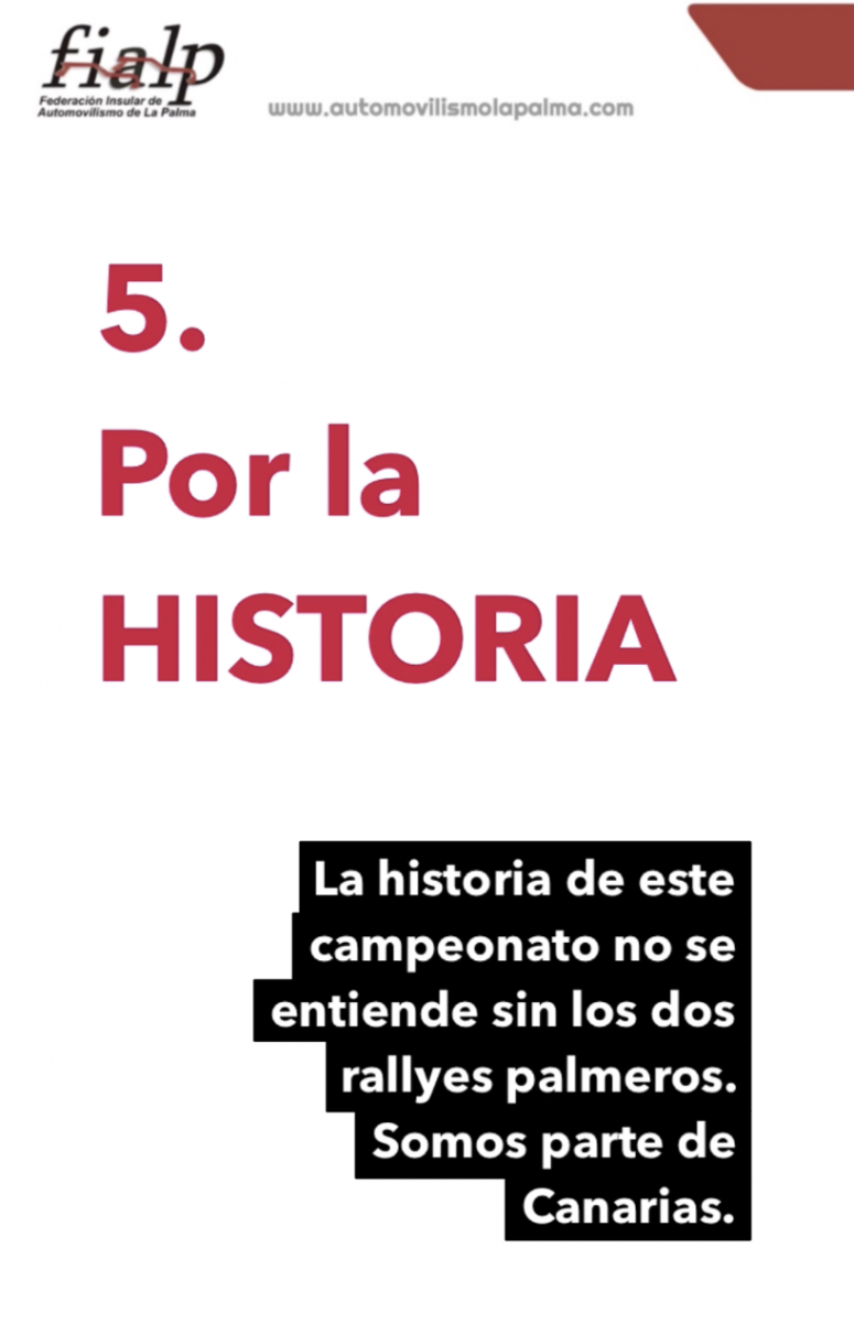 El quinto punto habla de la historia, argumentando que “la historia de este deporte no se entiende sin los dos rallys palmeros, afirmando: «Somos parte de Canarias».