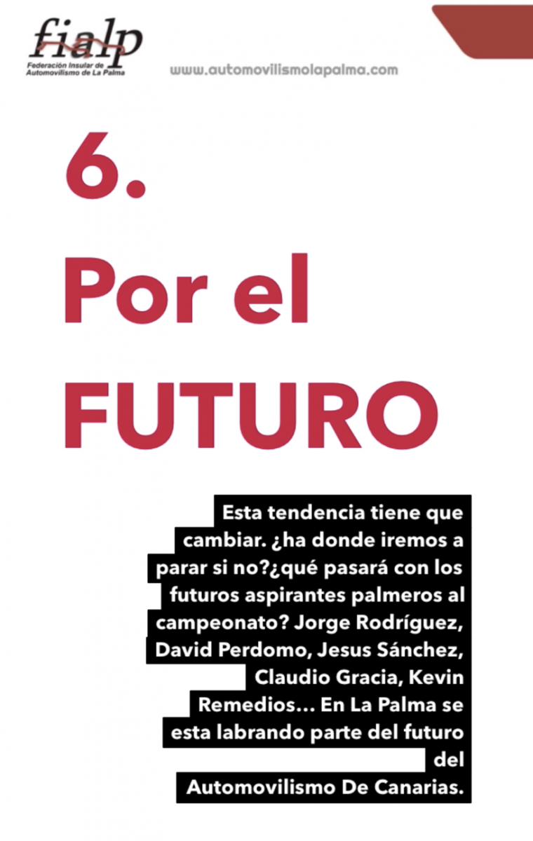 El sexto habla del futuro, argumentando que «esta tendencia debe cambiar. ¿Donde iremos a parar si no?; ¿qué pasará con los futuros aspirantes palmeros?». Exponen los casos de «Jorge Rodríguez, David Perdomo, Jesús Sánchez, Claudio García, Kevin Remedios… Y añaden que en La Palma se está labrando el futuro del automovilismo de Canarias».