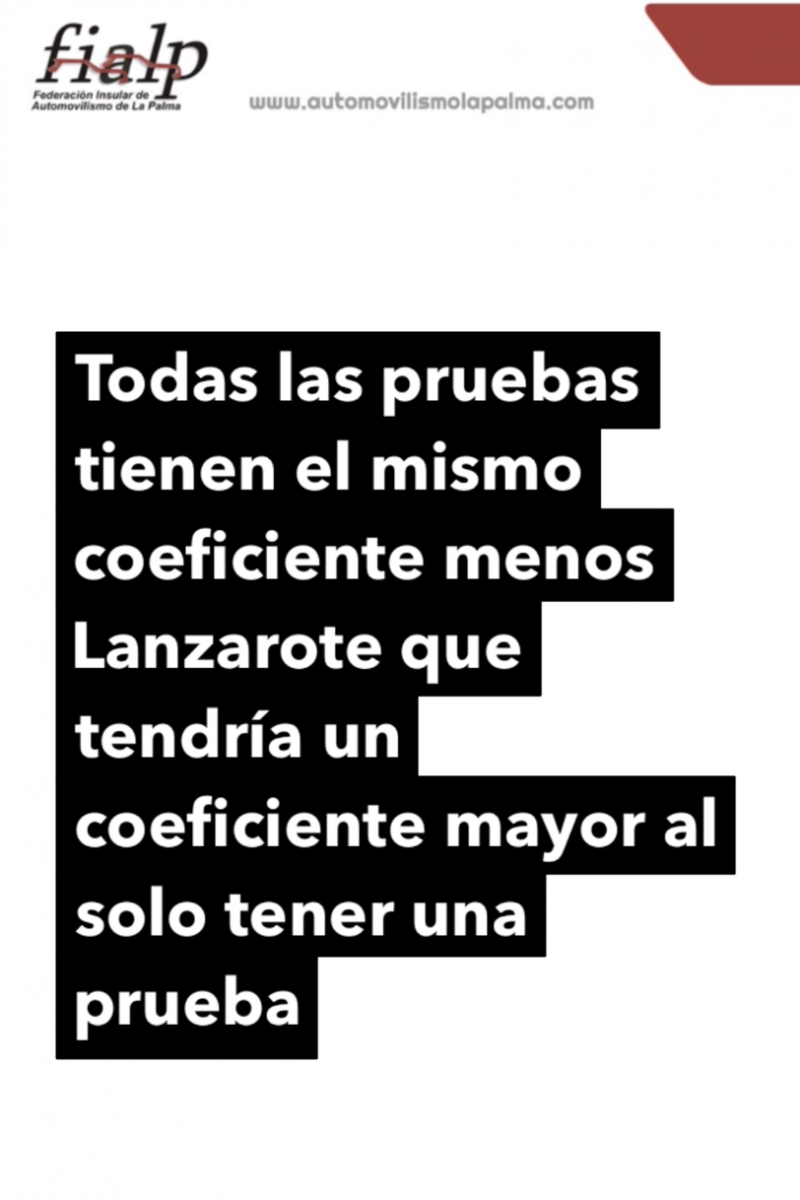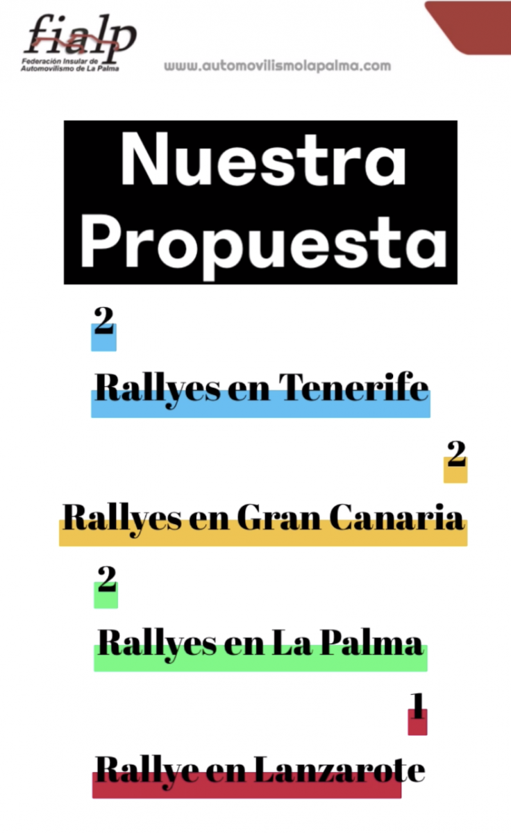 Por todo lo expuesto, desde la FIALP proponen dos pruebas en Tenerife, Gran Canaria y La Palma, con una en Lanzarote, que sería la única que tendría mayor coeficiente al celebrarse sólo una cita en Lanzarote.