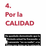 En el cuarto punto defiende que “debe ser por la calidad, afirmando que ha quedado demostrado que la fórmula actual ha fracasado: a Lanzarote no va nadie, a La Palma nos dejan en la estacada y un Campeonato prácticamente decidido desde su ecuador”.