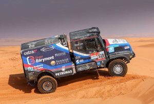 “Llevamos un camión de carreras desarrollado por el Team de Rooy con chasis de IVECO 2021 con una potencia de alrededor de 1.100 CV. Cuando sus dos depósitos de gasoil de 800 litros están llenos, su peso ronda los 9.000 kg. Dentro de la cabina vamos tres personas: el piloto, el copiloto navegador y el copiloto mecánico”.
