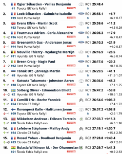 Takamoto Katsuta y Aaron Johnston (Toyota GR Yaris Rally1) ocupan la novena plaza, cerrando las diez primeras plazas Oliver Solberg y Elliott Edmondson (Hyundai i20 N Rally1).