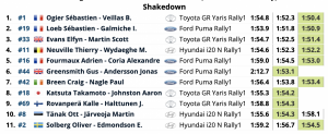 El actual campeón del Mundo de Rallys marcó tres cronos donde en cada uno de ellos iba mejorando en casi dos segundos su tiempo anterior (1:54.8,1:52.3 y 1:50.4), lo que le valió para ser los más rápidos y superar a sus compatriotas Sébastien Loeb y Isabelle Galmiche (Ford Puma Rally1) en sólo 0.5. Entre pilotos campeones del mundo anda la cosa.