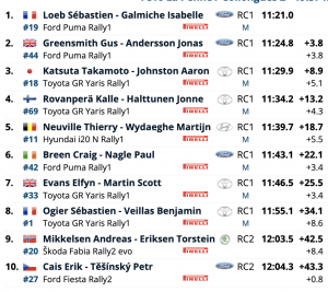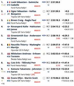 Loeb recortaba 1.1 en la primera especial, pero en la siguiente Ogier le endosaba otros 4.4, por lo que la diferencia se iba hasta los 24.6, pero en la penúltima especial los líderes pinchaban y, sumado al mejor tiempo de Loeb, se cambiaba el liderato, pasanmdo Loeb al frente con 9.5 y Ogier perdiendo una oportunidad de otro para repetir triunfo en el Monte-Carlo. Aún falta un tramo, por lo que todo puede pasar…