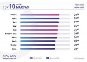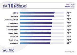En segunda posición, y a tan sólo unas décimas de Porsche, el índice GEOM Index de enero sitúa a Toyota con una valoración global de 78.89. La marca japonesa ha sido noticia por cerrar el pasado ejercicio en el tercer lugar de listado de ventas absoluto, así como por una amplia lista de novedades para empezar el año con el nuevo SUV eléctrico bZ4X como principal reclamo, así como por otros modelos como el Aygo X Cross o el Yaris Cross. Completa este primer podio de 2022 Ford, cuya presencia de sus novedades electrificadas, con el Mustang Mach-E como máximo exponente, sigue acaparando la atención de los internautas.