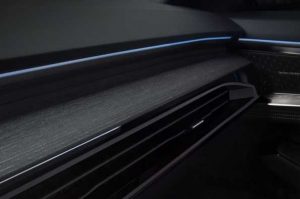 La parte superior del salpicadero está cubierta con un revestimiento mate y acolchado que resulta muy agradable al tacto. Una franja luminosa se prolonga hasta los paneles de las puertas, lo que contribuye a ampliar la percepción visual. Materiales sofisticados como la madera auténtica tratada con el método japonés «Maki-e» realzan el diseño del interior. Esta técnica de trabajo de la madera resalta las vetas naturales utilizando un paño para aplicar varias capas de pigmentos metálicos a la madera. Este tratamiento conserva la veta natural y el relieve de la madera al tacto. Por último, una elegante banda de cromo satinado envuelve cuidadosamente la rejilla de aireación horizontal.