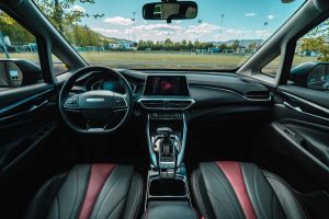 El espacioso habitáculo del EUNIQ 5 ofrece elevados niveles de calidad, ajuste y sofisticación. En la consola central se ubica la gran pantalla que aloja al sistema de info-entretenimiento táctil de 12,3 pulgadas. Frente al conductor, el cuadro de instrumentos es completamente digital. Los siete asientos de cuero microperforado y de generosas dimensiones, garantizan la comodidad de los ocupantes y, sobre ellos, un techo panorámico de gran tamaño refuerza la sensación de amplitud y luminosidad.