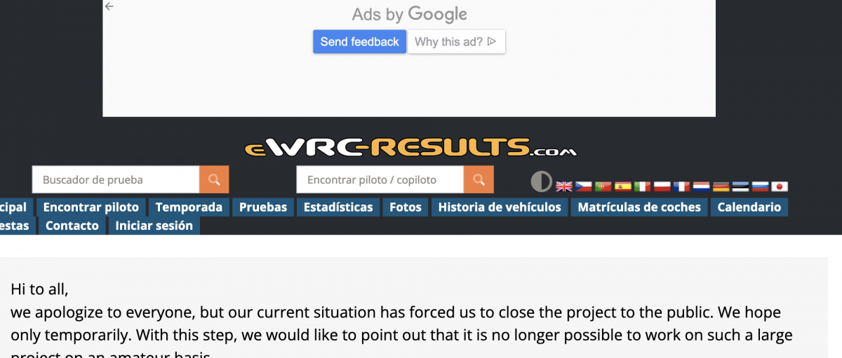 La página más completa de resultados de los rallys, de pilotos y de coches, ewrc-results.com, todo un referente para los que amamos este mundo, se ha visto obligado a cerrar por las dificultades económicas que supone poder continuar con este importante proyecto. Esperemos que se pueda encontrar una pronta solución, porque sin ellos, esto no es lo mismo. ¡Gracias por tan buen trabajo!