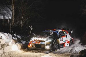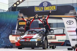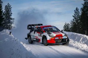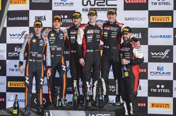 Durante la mayor parte del rally, los tres pilotos del equipo formaron parte de una reñida lucha por la victoria en carreteras desconocidas, de alta velocidad y cubiertas de nieve alrededor de la nueva base del evento en Umeå. Rovanperä estuvo en desventaja el viernes al tener que correr primero en la ruta como el piloto mejor clasificado del campeonato, pero concluyó el sábado aventajando a su compañero de equipo Elfyn Evans por 8,3 segundos.