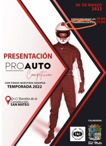 Este domingo 6 de marzo, desde las 9.00 de la mañana y hasta las 14.00, estará expuesta en el Casco de la Vega de San Mateo, en la C/ Rambla de la Constitución, una muestra del elenco de vehículos de competición que formarán parte de ProAuto Competición, a su vez de la Copa Marbella Canarias y del Trofeo ProAuto, y además, en colaboración con el Tinamar Automóvil Club con quién se comparte acto de apertura de la temporada.