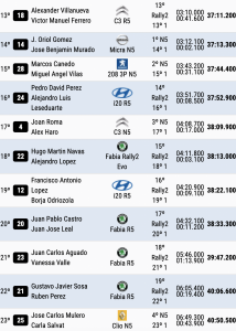 Hasta la décimo tercera plaza descienden Alexander Villanueva y Víctor Manuel Ferrero (Citroën C3 R5), seguidos de la primera unidad N5, Oriol Gómez y José Benjamín Murado (Nissan Micra N5).