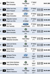 Undécimos son los canarios Juan Carlos Quintana y Yeray Samuel Mujica (Skoda Fabia R5), que están a 7.3 de entrar en el top 10 y superando en 1,5 a Eduard Pons y Alberto Chamorro (Skoda Fabia Rally2 Evo), décimo segundos.
