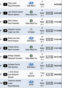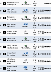 Novenos son los paraguayos Rodrigo Zeballos y Sebastián González (Skoda Fabia Rally2 Evo), que superan en 5.6 a Surhayen Pernía y Alba Sánchez (Hyundai i20N Rally 2), que cierran las diez primeras posiciones.