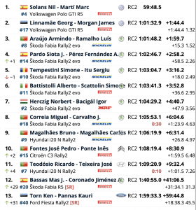 Los lusos Armindo Araújo y Luís Ramalho (Škoda Fabia Rally2 evo) ocupan la tercera plaza a 15.3 del segundo lugar y superando en 58.5 a los españoles Javier Pardo y Adrián Pérez (Škoda Fabia Rally2 evo), cuartos.