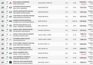 Séptimos eran Ayoze Benítez y Patricia González (Mitsubishi Lancer Evo VII) a pesar de una penalización de medio minuto, seguidos de Tato Suárez y María Hernández (Ford Fiesta Rally2), que también fueron penalizados con 20 segundos.