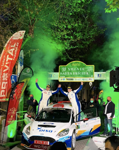 El piloto tinerfeño Enrique Cruz (Ford Fiesta Rally2), que junto al copiloto grancanario Yeray Mujica consiguieron la victoria en el Rally Villa de Santa Brígida, muestra su felicidad por un ajustado triunfo.