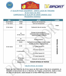 Este sábado 26 de marzo comienza la temporada de competiciones en tierra con la primera cita de Santa Lucía, correspondiente al Campeonato Insular de Slaloms en Tierra de Gran Canaria, que se disputará en el tramo de unos 4,1 km localizado en la localidad costera de Pozo Izquierdo y el Barranco de Tirajana, siendo la organización un año más a cargo del CD. Evesport.