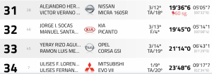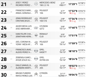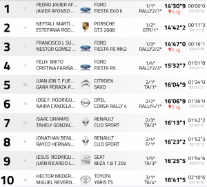 A casi un minuto de los anteriores andan Félix Brito-Caroliña Fariña (Ford Fiesta R5), equipo que da paso al primero de los clasificados en el apartado de tracción delantera, Juan Fuentes-Gara Peraza. Los del Citroën Saxo aventajan en dos segundos a José Francisco Rodríguez-Naira González (Opel Corsa Rally4), que arrastran, también, una penalización de cinco segundos.