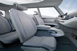 El segundo modo estacionario denominado Enjoy, que convierte el interior en un espacio de descanso al girar la orientación de tres filas de asientos. En este modo, el portón trasero se abre para dar a todos los ocupantes la oportunidad de conectar con el entorno exterior y mirar más allá del vehículo, mientras están sentados cómodamente dentro del SUV eléctrico.