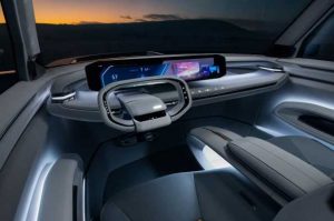 La sensación de «mañana» se extiende desde el futurista habitáculo hasta el volante, reinterpretado como un panel emergente de dirección, una extensión del espacio interior integrada y armonizada con él.