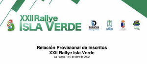 Publicamos la relación provisional de inscritos del XXII Rallye Isla Verde, cita del Campeonato de Canarias de Rallyes de Tierra que se disputará este fin de semana en la Villa de Garafía, La Palma. La lista oficial se publicará este miércoles a las 20:00 horas.