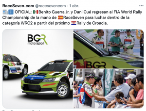 Y lo hará con el equipo español RaceSeven y el copiloto asturiano Dani Cué, estando programado el Rally de Croacia como su primera participación del 21 al 24 de abril.
