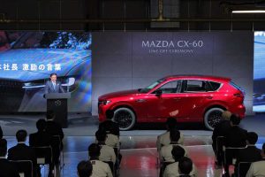 La producción en serie del CX-60 europeo se inició el pasado 15 de marzo. El primer cargamento de vehículos con destino a Europa zarpará del puerto de Nakanoseki el 26 de abril.