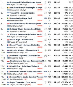 Terceros son los estonios Ott Tänak y Martin Järveoja (Hyundai i20 N Rally1), que están a 47.3 del primer puesto, a 34.8 del segundo y superando en sólo 1.9 a Craig Breen y Paul Nagle (Ford Puma Rally1), cuartos.