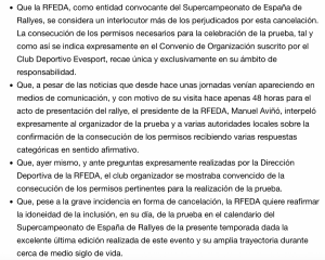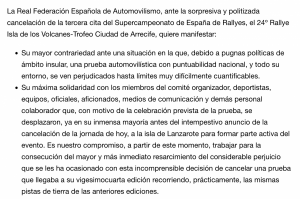 La Real Federación Española de Automovilismo (RFEA) ha emitido un comunicado donde informa que se trabaja en el para la «consecución del mayor y más inmediato resarcimiento del considerable perjuicio por la cancelación del Rally Isla de Los volcanes».