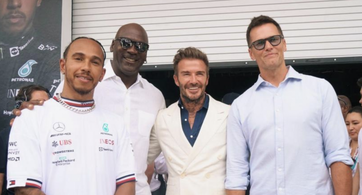 Esta instantánea tuvo lugar en el box de Mercedes, donde Lewis Hamilton, 7 veces campeón del mundo de Fórmula 1 recibió la visita de Michael Jordan, Tom Brady y David Beckham, cuatro exitosos deportistas de baloncesto, fútbol americano y fútbol.