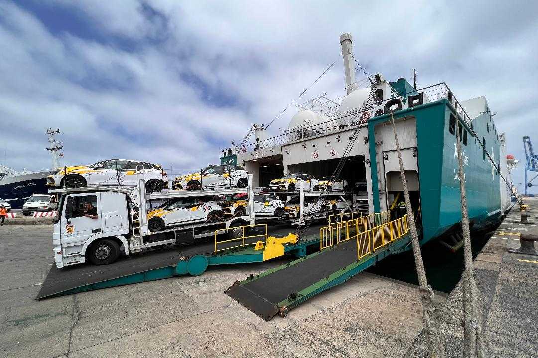 Los vehículos de los equipos internacionales ya han desembarcado en la isla de Gran Canaria. El buque ‘Marie Curie’, de Fred. Olsen Express & Balearia, ha sido objetivo de las primeras fotografías de los aficionados que, como cada año, acuden a este primer contacto con los vehículos.