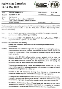 El Skoda Fabia Rally2 del piloto italiano Alberto Battistolli ha pesado al término de la tercera cita del Campeonato de Europa 3.5 kilogramos menos de lo permitido en el reglamento, por lo que los comisarios han decidido descalificarlo del Rally Islas Canarias 2022.