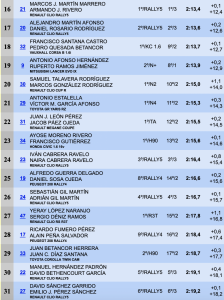 Décimo sextos y primeros de la Clio Trophy Canarias se sitúan Marcos Martín y Armando Rivero (Renault Clio Rally5), superando en sólo 0.2 a sus grandes rivales entre los Rally5 a Alejandro Martín y Daniel Rosario (Renault Clio Rally5).