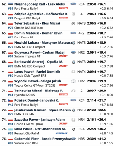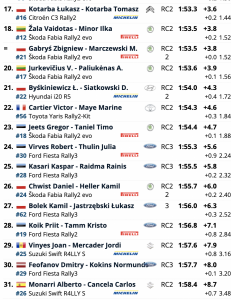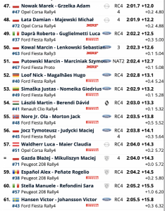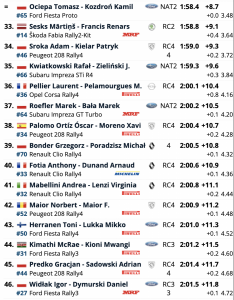 El resto de la clasificación estaba compuesta casi en su totalidad por unidades Fabia Rally2 Evo, con la estrella rumana Simone Tempestini liderando la lista de Škoda. Estaba apenas 0,2 segundos por debajo de Kristensson y comenzará el sábado con solo 0,5 segundos sobre el favorito local Miko Marczyk.