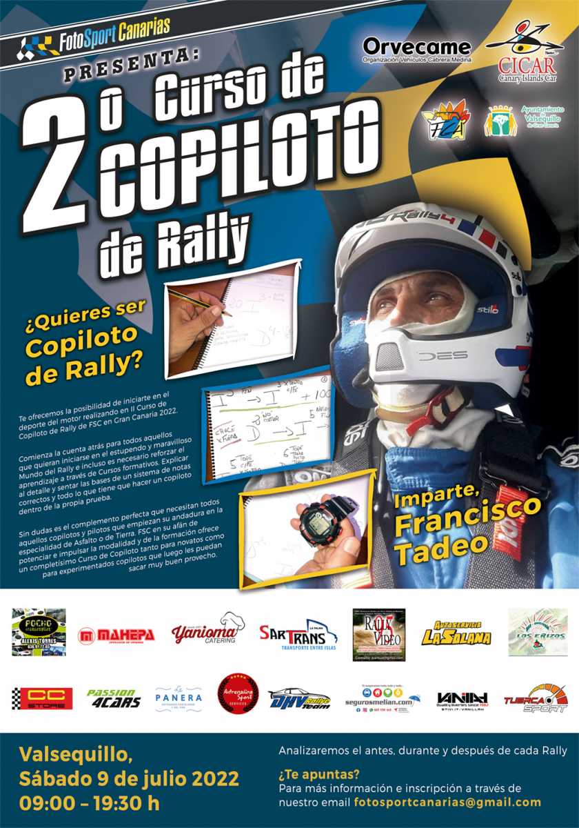 A tan solo doce días del cierre de inscripción y a veinticinco días para su comienzo FSC que dirige Manuel Guillén, presenta el Cartel Oficial del 2º Curso de Copiloto que se celebrará el sábado 9 de julio en el Local Social del Valle de San Roque de Valsequillo.